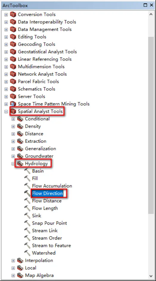 在ArcToolbox内点击“Spatial Analyst工具\水文分析\流向”,调用流向工具。