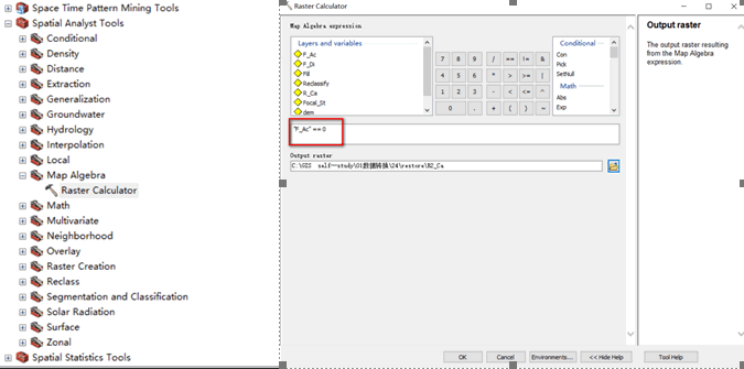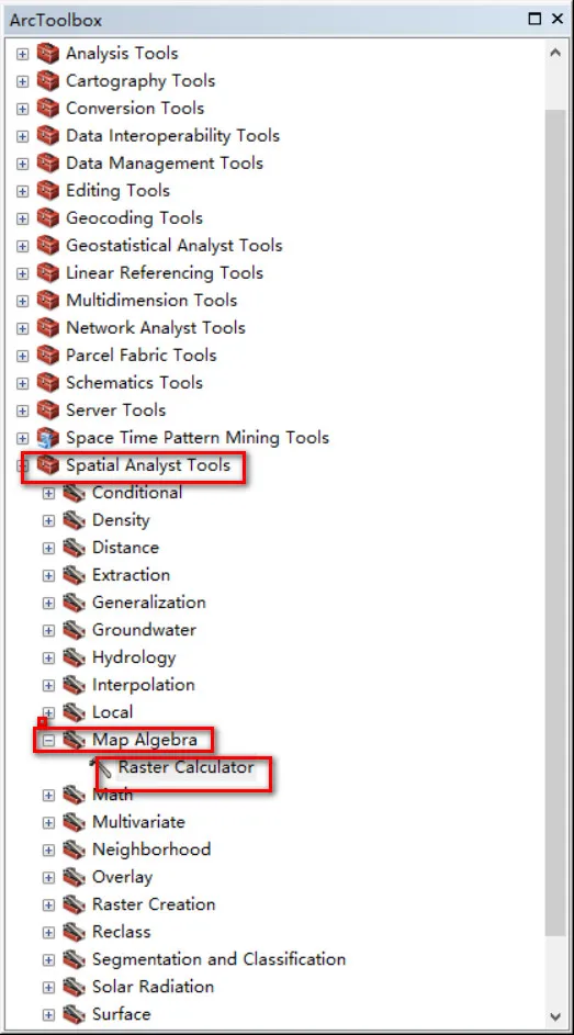 在ArcToolbox内点击“Spatial Analyst工具\地图代数\栅格计算器”,调用栅格计算器工具。