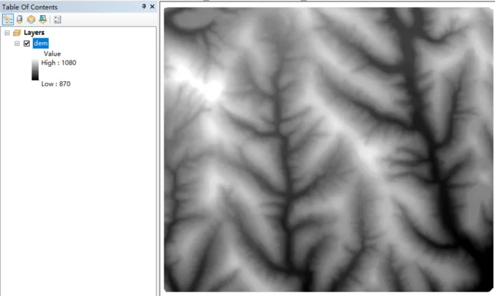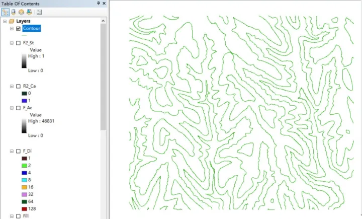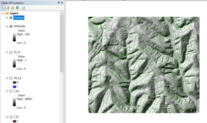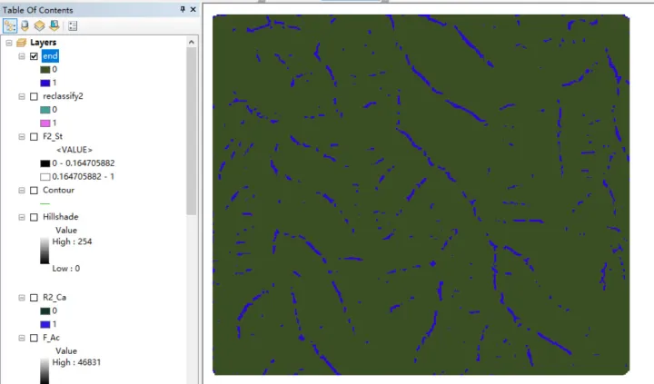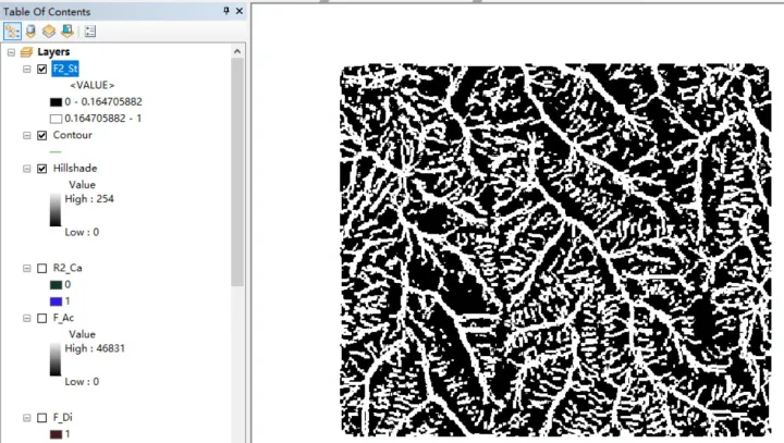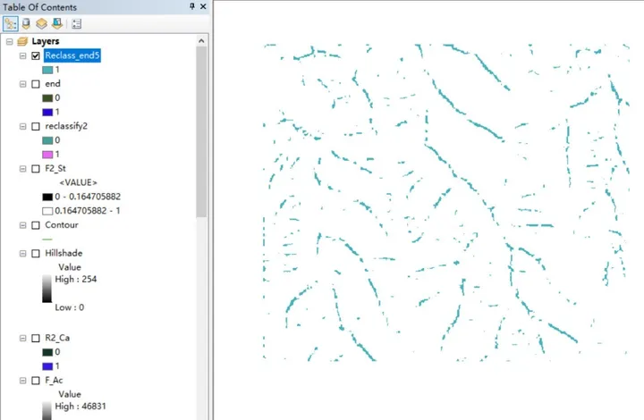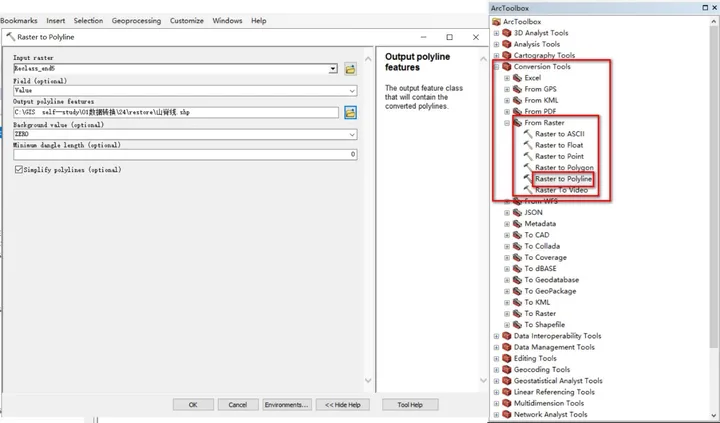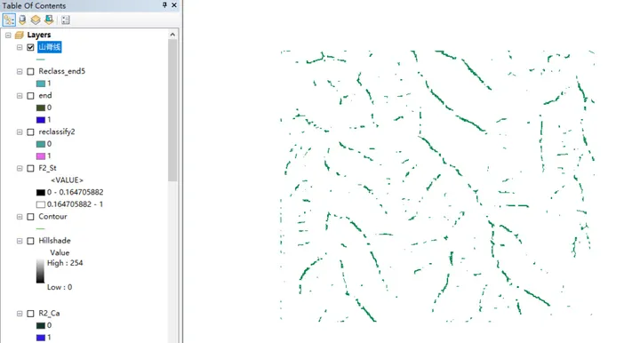 点击确定之后可以得到山脊线如果需要将山脊线提取成矢量,可以在ArcToolbox内点击“转换工具\由栅格转出\栅格转折线”将山脊线栅格转换为矢量。