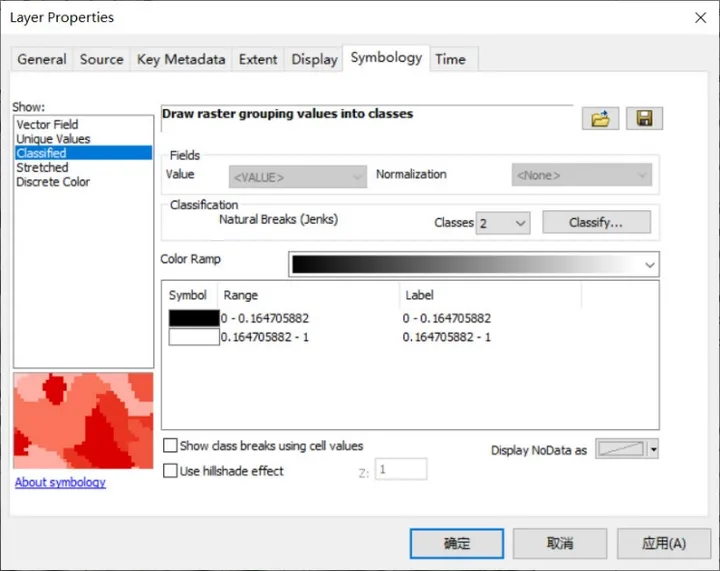 在显示的图层属性对话框内,选择符号系统选项卡,选择已分类,类别设置为2,以等值线图和晕渲图作为辅助判断,不断地调整分类的临界值,属性值越接近1的栅格越有可能是山脊线的位置,最终确定分类阈值为0.52585。