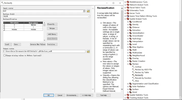 在ArcToolbox内点击“Spatial Analyst工具\重分类\重分类”,调用重分类工具。在显示的重分类对话框内,输入栅格为上一步的计算结果,将0赋值为NoData,1赋值为1。