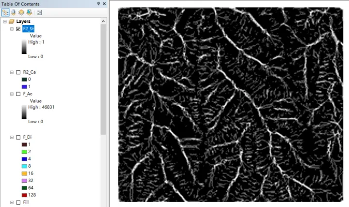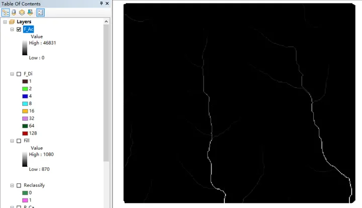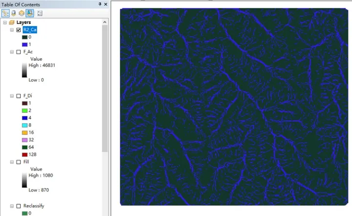 在ArcToolbox内点击“Spatial Analyst工具\地图代数\栅格计算器”,调用栅格计算器工具。在显示的栅格计算器对话框内,输入下面的公式:"F_Ac" == 0,获取流量为0的区域。点击确定后得到计算结果,如下图所示。