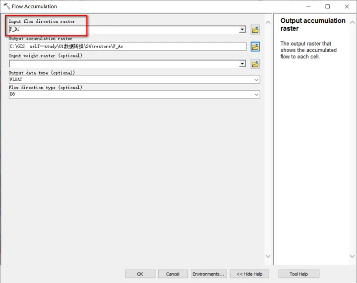 在显示的流量对话框内,输入流向栅格数据为上一步得到的流向结果点击确定之后得到流量栅格。