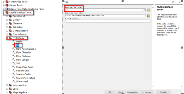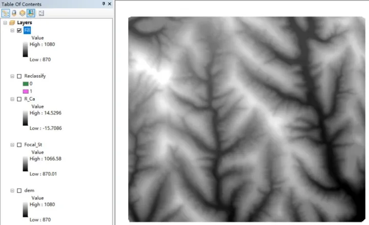 在ArcToolbox内点击“Spatial Analyst工具\水文分析\填洼”,调用填洼工具。在显示的填洼对话框内,输入表面栅格数据为下载的dem数据,点击确定后可以得到填洼后的栅格,如下图所示。