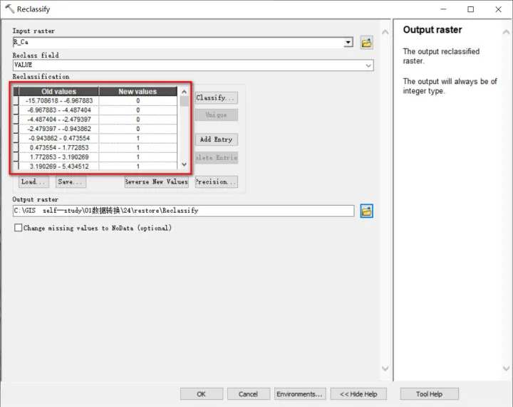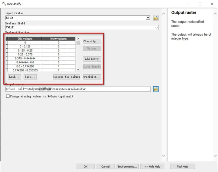 在显示的重分类对话框内,以值0为界,小于0赋值为0,大于0赋值为1,点击确定之后可以看到重分类后的效果,如下图所示。