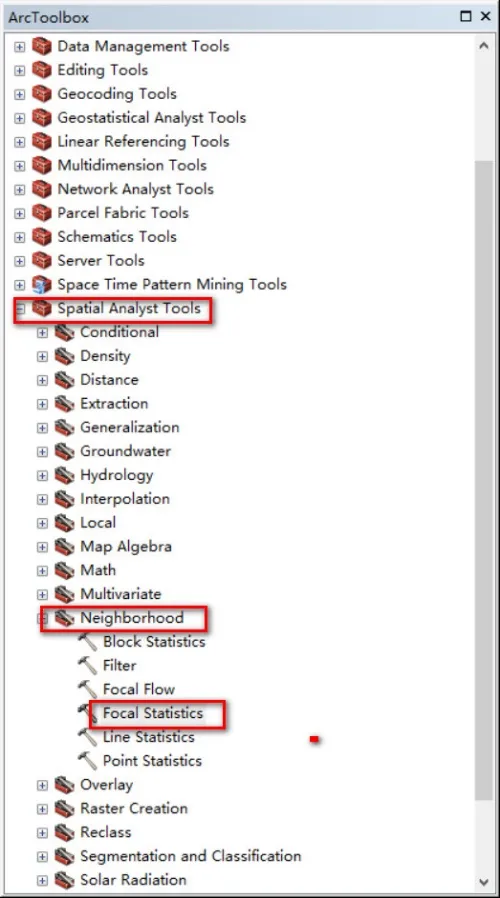 通过邻域分析平滑山脊线,在ArcToolbox内点击“Spatial Analyst工具\邻域分析\焦点统计”,调用焦点统计工具。