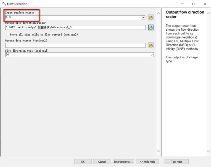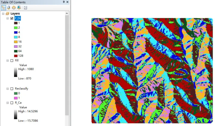 在显示的流向对话框内,输入表面栅格为上一步填洼后的栅格,如下图所示。点击确定之后可以得到流向的效果。