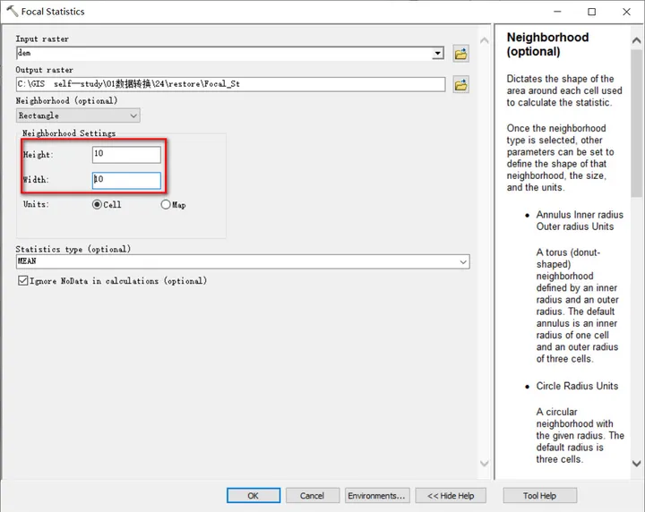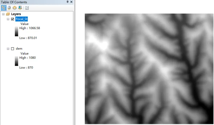 在显示的焦点统计对话框内,输入下载的DEM数据,设置邻域高度和宽度为10。点击确定之后得到统计栅格,如下图所示。