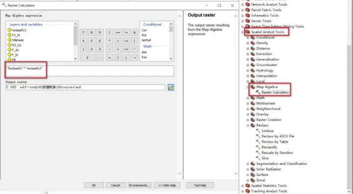 在显示的栅格计算器对话框内,输入下面的公式:"Reclassify " * " Reclassify2 ",其中" Reclassify2 " 为上一步重分类结果," Reclassify "为最开始得到的正地形。点击确定之后可以得到栅格计算结果,