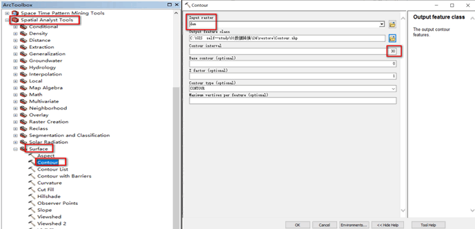 在ArcToolbox内点击“Spatial Analyst工具\表面分析\等值线”,调用等值线工具。