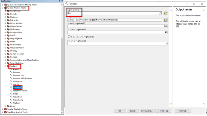 在ArcToolbox内点击“Spatial Analyst工具\表面分析\山体阴影”,调用山体阴影工具。