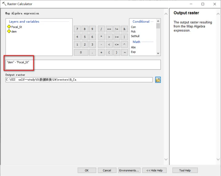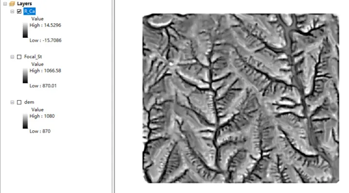 在显示的栅格计算器对话框内,输入下面公式:"dem" - "Focal_St"。点击确定之后得到计算结果,如下图所示。