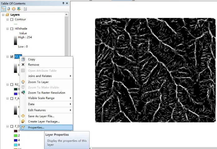 在焦点统计的栅格图上点击右键,选择属性,如下图所示。