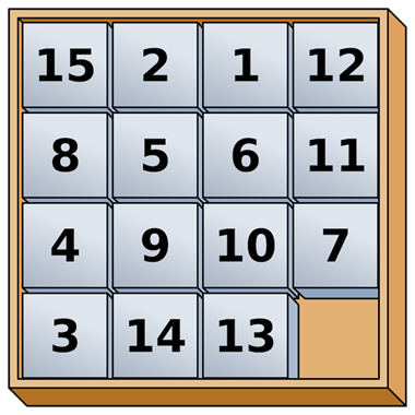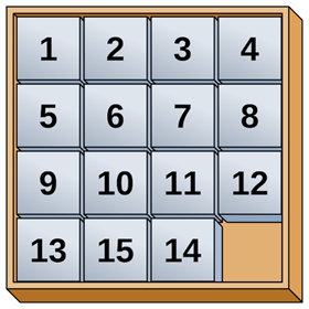 19世纪末,山姆·洛伊德提出了另一个非常著名的谜题。作为一位美国象棋选手,他向世界发起挑战,要人们来解决他的15个格点的拼图问题(15 puzzle)。
