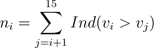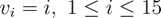 对于从1到15的每个值v,我们应该计算从具有该值v的单元的位置i开始向右开始有多少个值小于v。