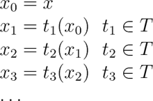 假设有一个数学对象x和一组变换T (变换代表对 x 进行某些操作),我们可以取集合T中的任何元素(即一个变换操作)并将其应用于x,来改变x的状态。这样,我们就可以形成x的不同态的链。