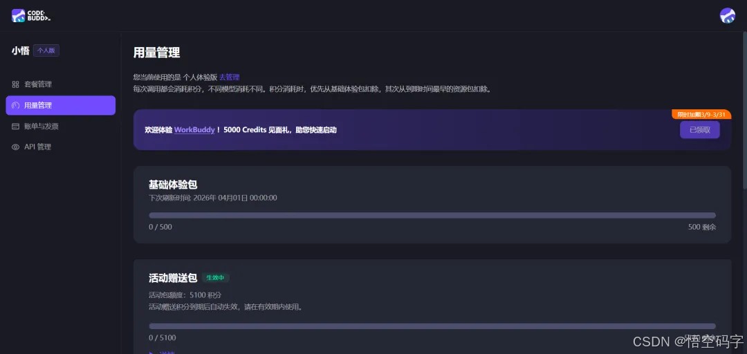 有个好的地方就是,不管是新用户还是老用户,注册WorkBuddy即送5000 Credits,点击领取。