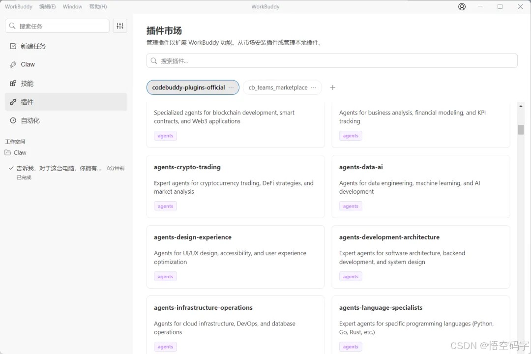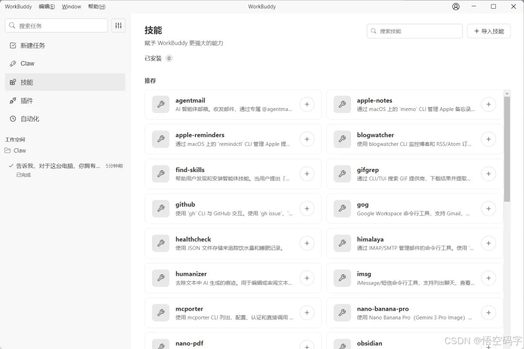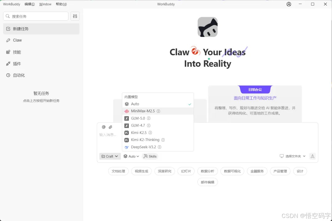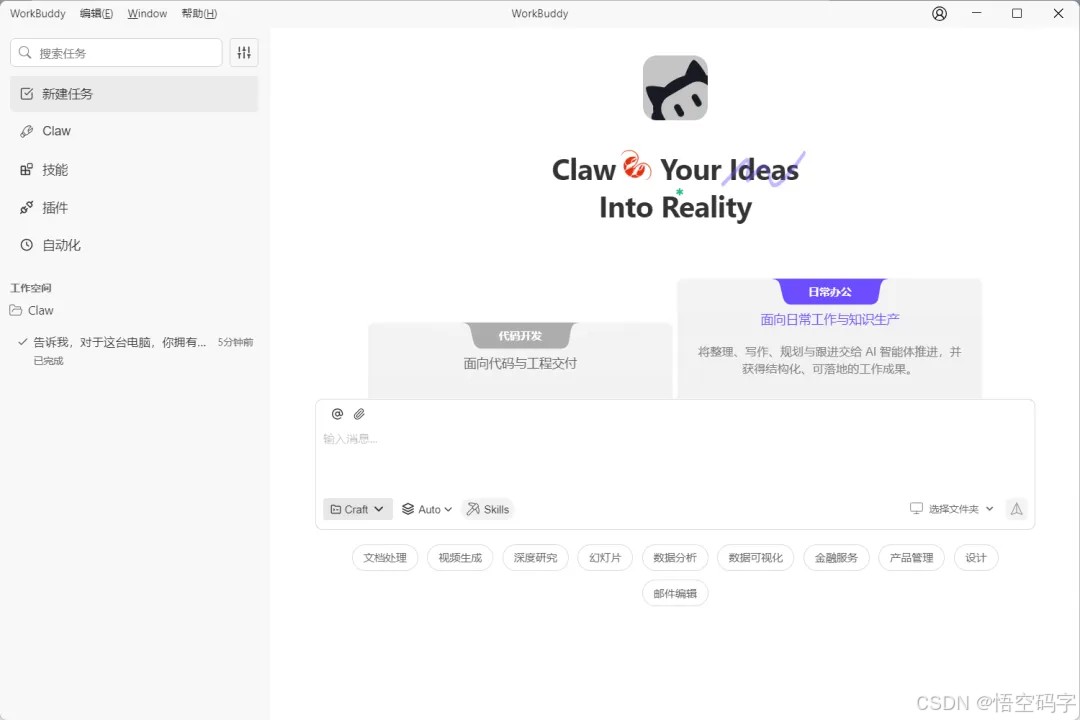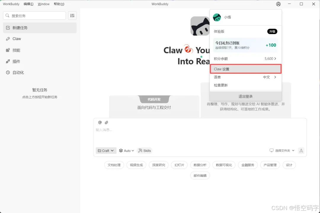 看一下WorkBuddy面板的功能展示,有新建任务、Claw、技能、插件和自动化五大功能区。