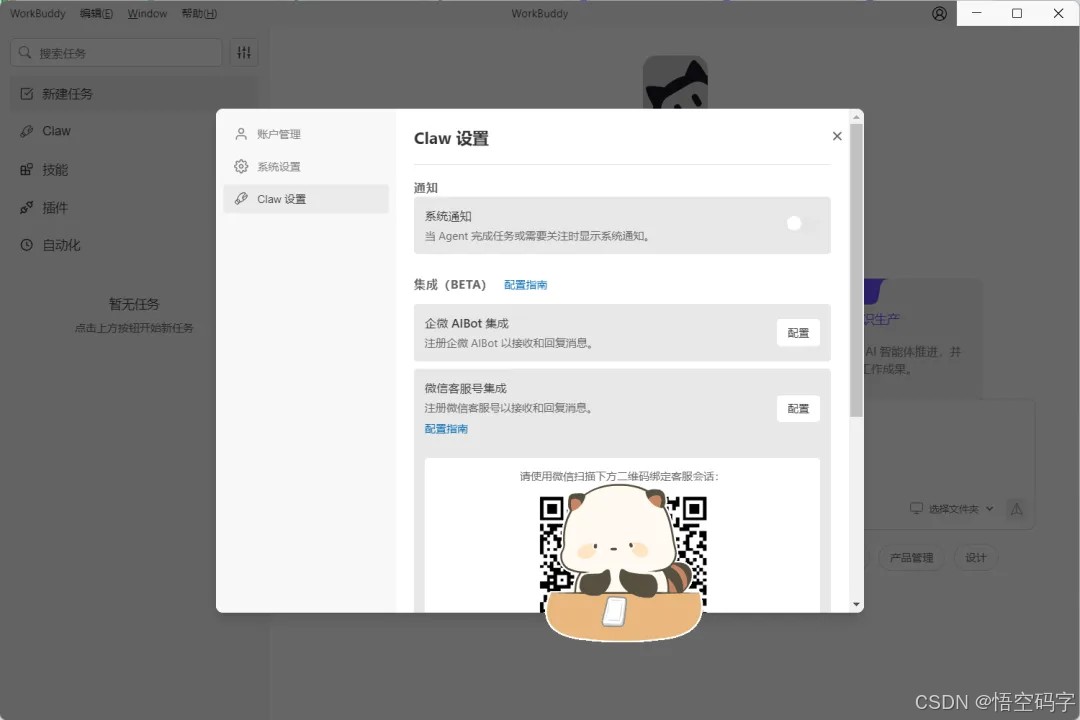 WorkBuddy会展示一个用来微信扫码绑定的二维码。