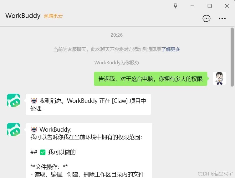 完成绑定后,在刚刚那个微信的会话列表中,找到“客服消息”-“WorkBuddy”,就可以给开始发送指令了,让电脑的“小龙虾”开始干活。