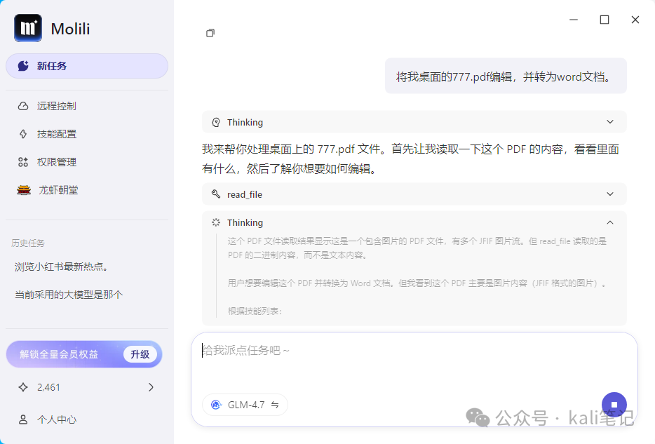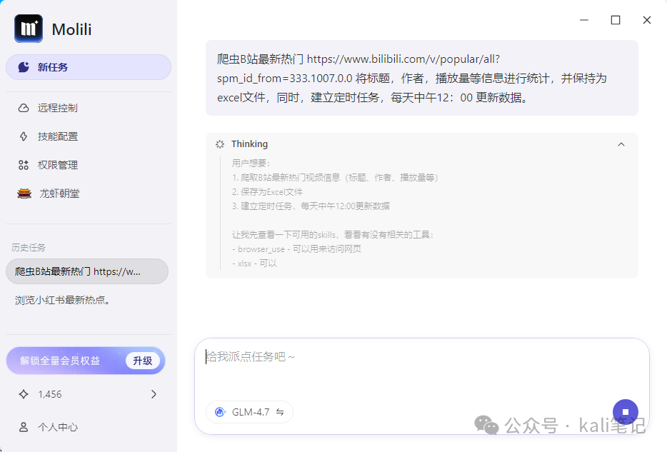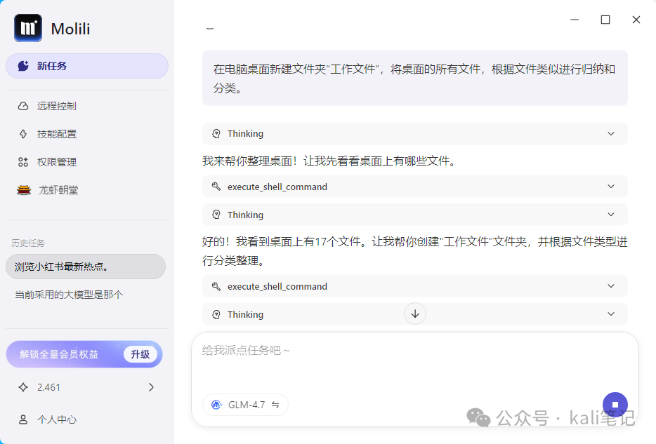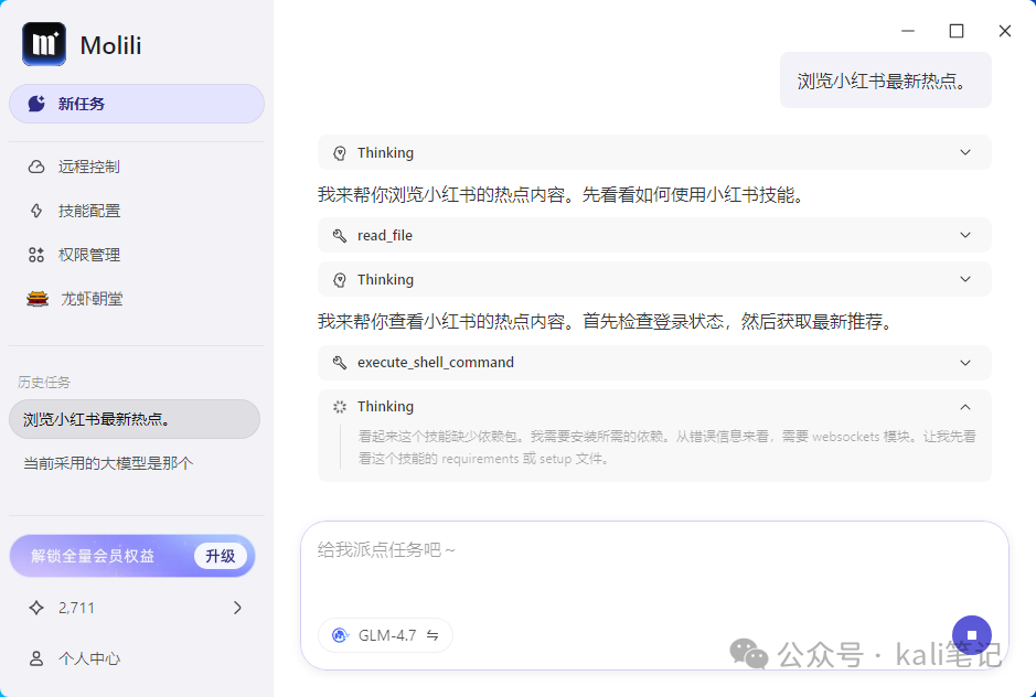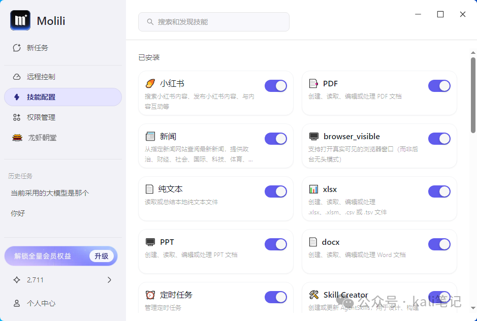 AI 智能体强不强,核心看落地执行的技能库。Molili 内置了超 8000 个经过安全审查的可用技能,覆盖办公、新媒体、数据处理、文件管理、网页操作等全场景,接下来,为大家演示效果。