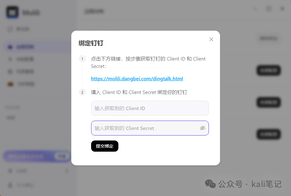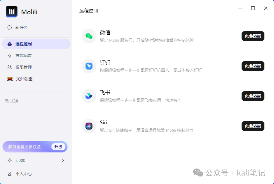 Molili 最贴心的本土化优化,就是对国内主流办公、社交工具的无缝适配。无需复杂代码配置,跟着内置的保姆级教程分步操作,就能一键接入微信、钉钉、飞书、Siri。 这里,我们通过接入微信为例!