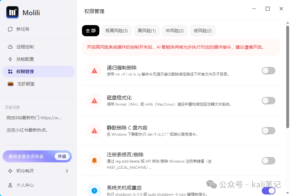 在使用Ai时,最担心的就是数据安全和系统风险。Molili 专门做了本土化的安全升级,在权限管理模块,对不同风险等级的操作做了分级管控,使用更简单、更方便、更安全。