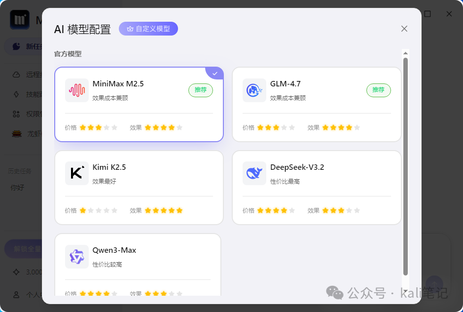 不用再头疼原版工具仅适配海外模型、需要单独申请 API Key和配置的麻烦,Molili 内置了 DeepSeek、Qwen、Kimi、GLM 等多款国内主流大模型,在 AI 模型配置界面一键即可切换!