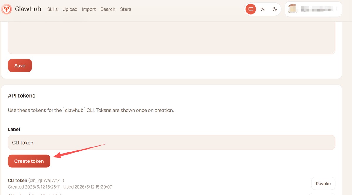 浏览器登录clawhub,链接为https://clawhub.ai/settings。手动生成token