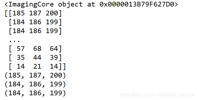 from PIL import Image import numpy as np im = Image.open("a.jpg") sequ = im.getdata() print(sequ) print(np.array(sequ)) sequ_list = list(sequ) print(sequ_list[0]) print(sequ_list[1]) print(sequ_list[2])