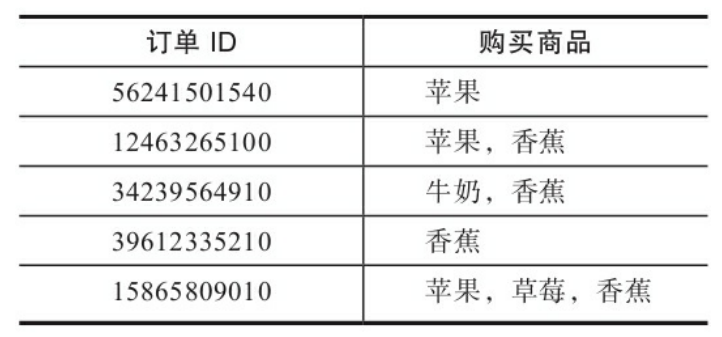 - 第二种是合并后的交易数据,数据格式是每个数据行以订单ID或客户ID作为分析的参照维度,如果同一个订单内有多个商品,那么多个商品会被合并到一条记录中,如下图: