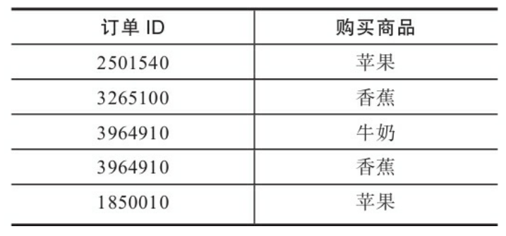 - 第一种是事务型交易数据,典型的数据格式是每个数据行以订单 ID或客户ID作为关联分析的参照维度,如果同一个订单内有多少个商品,那么将会有多个数据行记录,如下图: