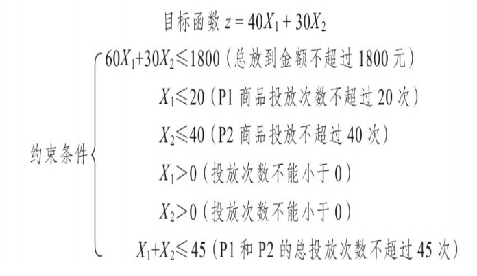 为了解决问题,我们假设P1和P2两种商品的投放次数分别是X1和X2,最大化销售毛利为z,此时: