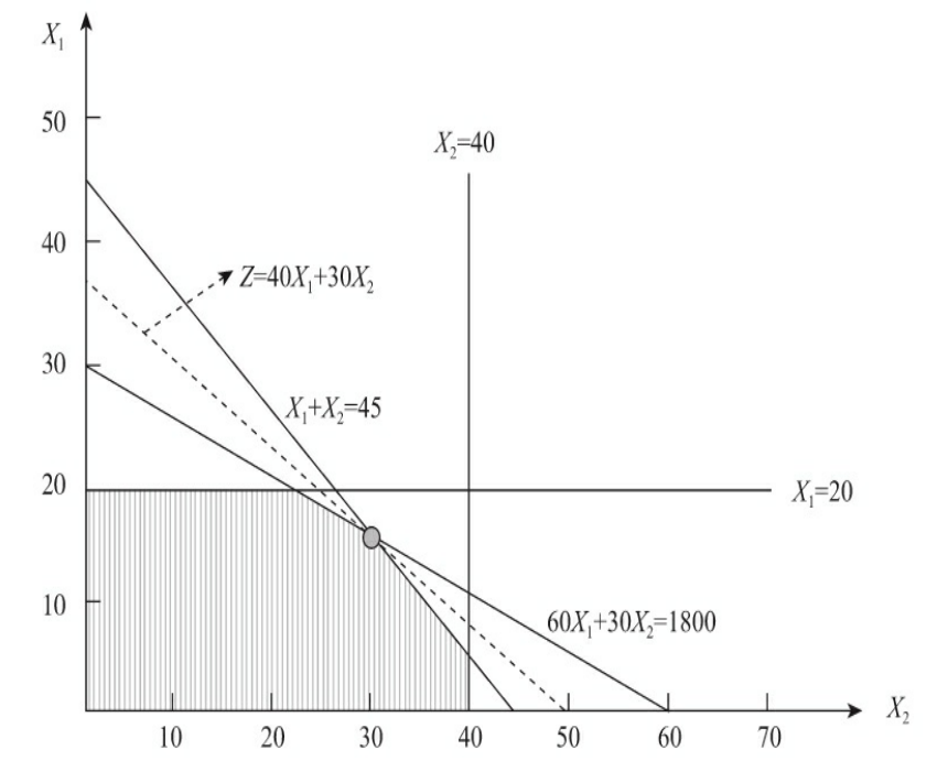 通过图可以发现最优解是目标函数与X1+X2=45和60X1+30X2=1800的交点,求解两个函数的解用到的是九年义务教育阶段基本数学知识。