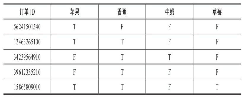 - 第三种是真值表格数据,每个数据行是每个订单ID或客户ID,列是每个要关联项目的是否购买值,通常以T或F来表示,如下图: