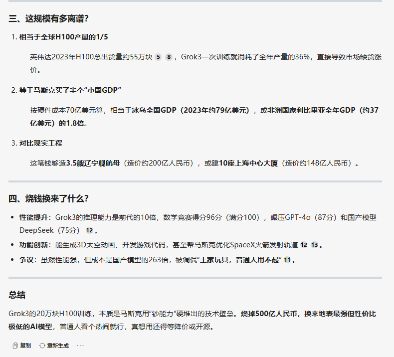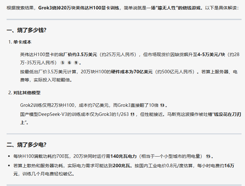 Grok3用了20万块顶级显卡(H100),训练时耗电量堪比一座小城市。