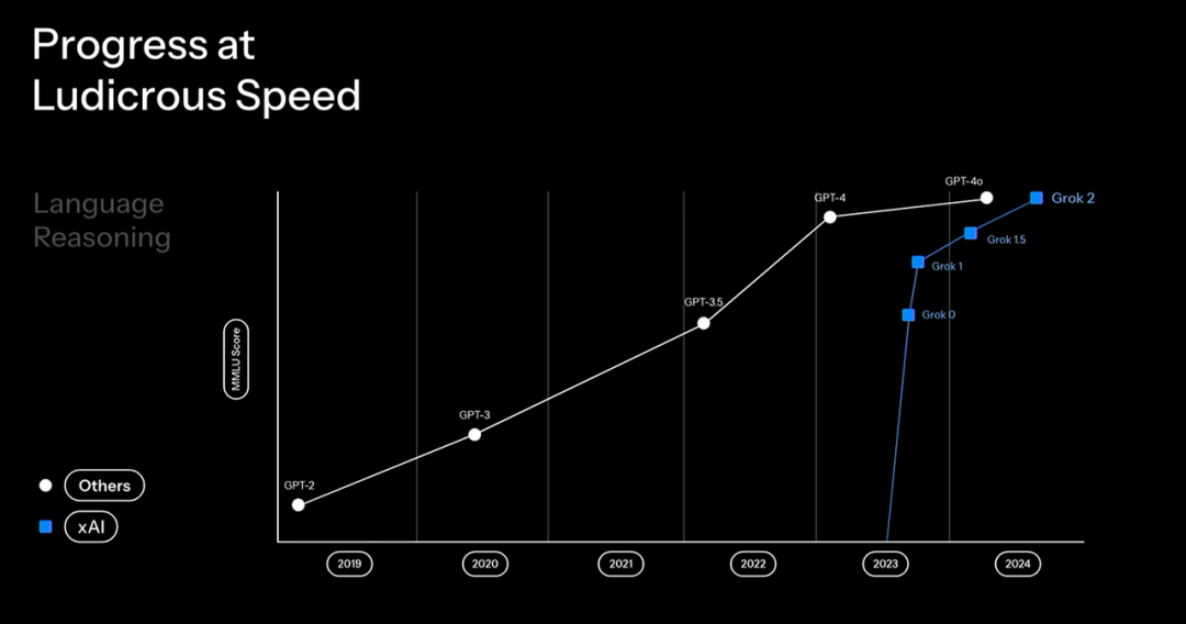 马斯克嘚啵嘚的意思,就一句话:Grok只用了两年多,就能匹敌GPT五六年的能力。