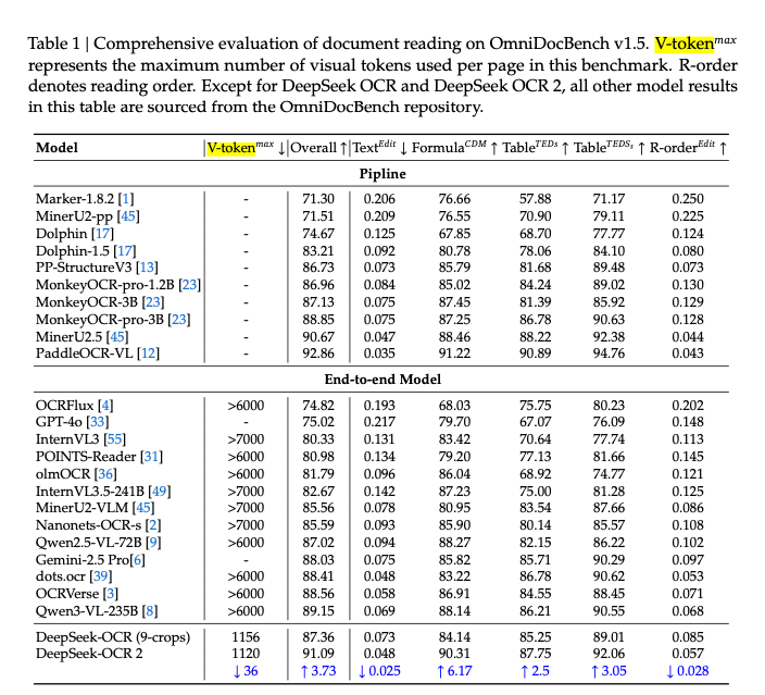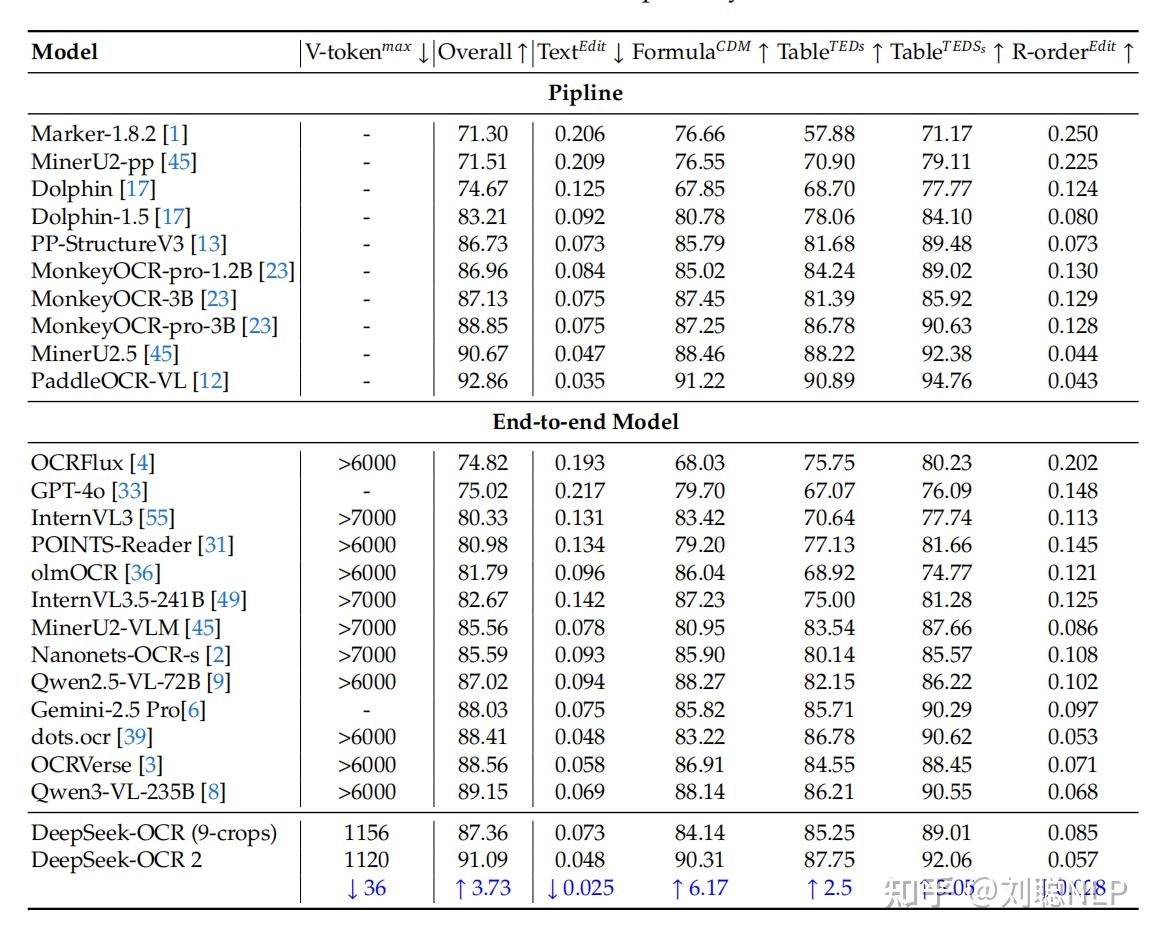 可以看到在纯端到端上DeepSeek-OCR-2相较于DeepSeek-OCR有很大提升,