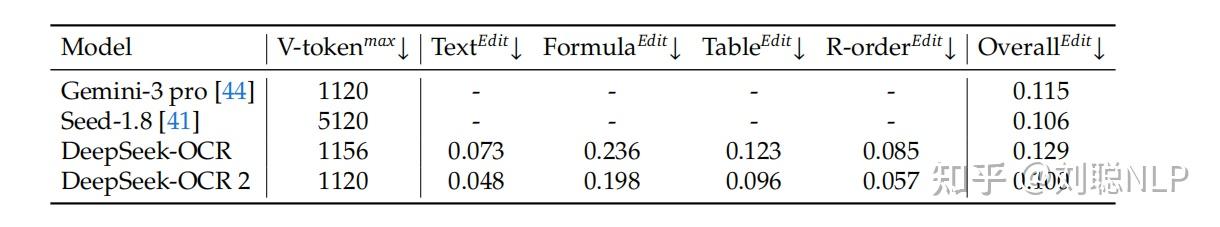 - Token 预算更「抠门」了: V1 的 Gundam 模式用了 1156 个 token。V2 上限控制在 1120 个(为了对齐 Gemini-3 Pro 的视觉预算)。在 token 数减少的情况下,性能反升,说明「逻辑重排」比「堆分辨率」更管用。