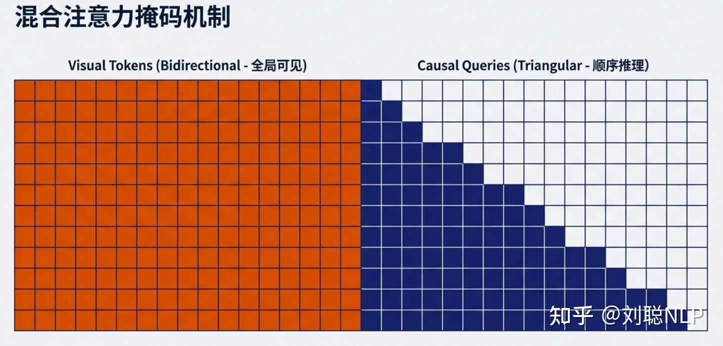 (Query to Visual): 所有的 Query Tokens 都能看见所有的 Visual Tokens。这保证了查询时能利用全图信息。 - 右下角