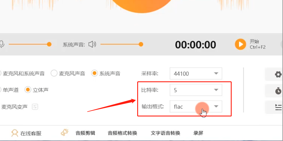 2、默认立体声声道,要录制高品质音频的话,最好选择输出格式为“flac”格式,然后将比特率调到最高值;