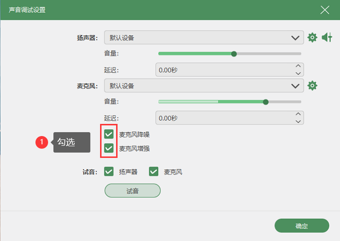 第3步:软件支持麦克风降噪功能,可以在声音调试设置里勾选麦克风增强与降噪,以满足不同的录音需求。