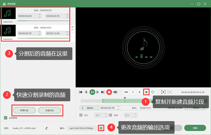 第4步:录音完成后,软件还提供了丰富的编辑功能,用户可以对录音文件进行剪辑。编辑完成后,选择保存录音文件的格式和路径。