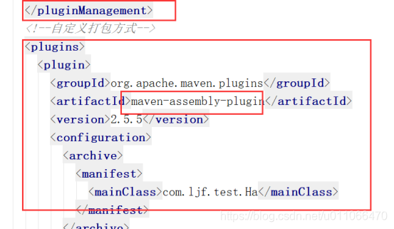 2.我使用maven打包插件maven-assembly-plugin,将其配置添加到<plugManagement><plugs>.. ..</plugs></plugManagement>中间。