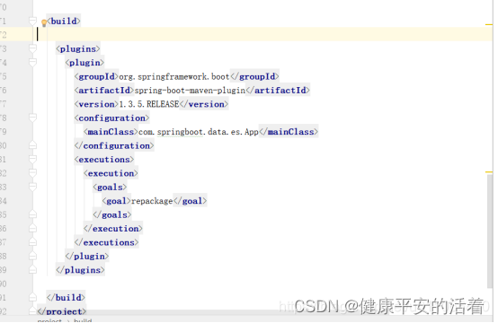 <plugins> <plugin> <groupId>org.springframework.boot</groupId> <artifactId>spring-boot-maven-plugin</artifactId> <version>1.3.5.RELEASE</version> <configuration> <mainClass>com.springboot.data.es.App</mainClass> </configuration> <executions> <execution> <goals> <goal>repackage</goal> </goals> </execution> </executions> </plugin> </plugins>