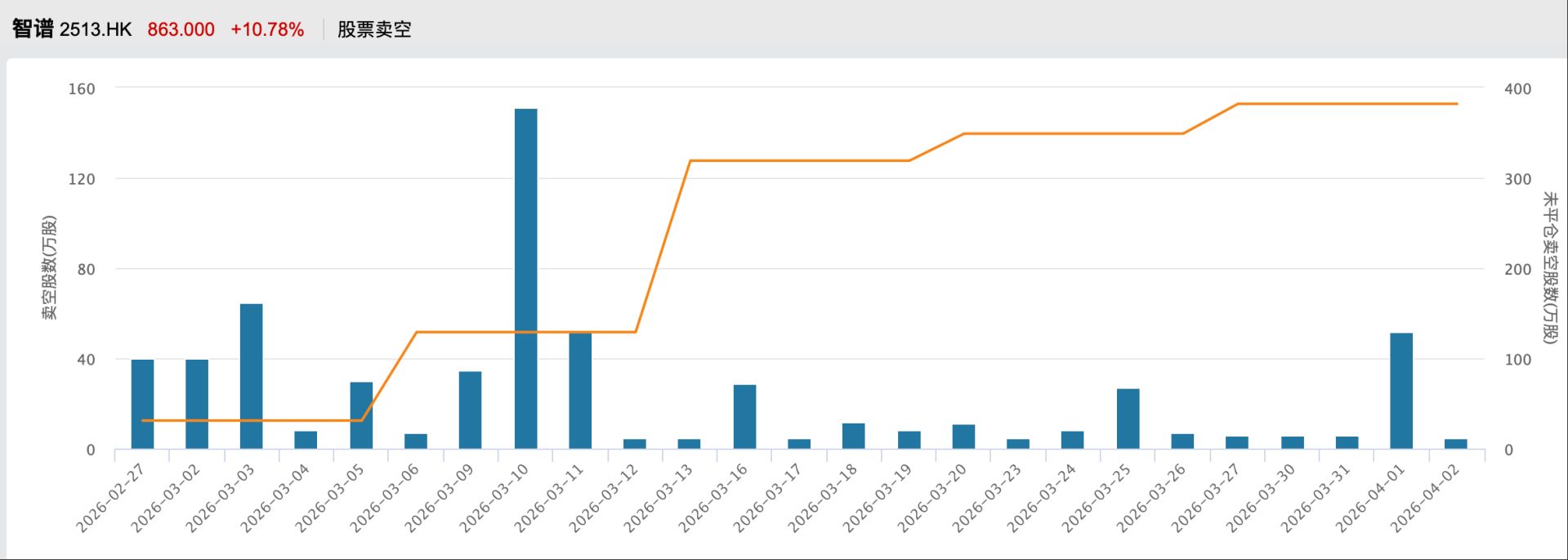 值得注意的是,随着近期智谱股价不断走高,卖空交易数据大幅走低,市场“空头”明显撤退。据WIND数据,智谱于今年2月27日纳入卖空交易,截至3月10日,卖空股数最高达到150.79万股,卖空金额达9.5亿港元。但此后,卖空股数大幅回落。截至4月2日,卖空股数已回落至4.75万股,较高点下降96.85%;卖空金额更是大幅回落至0.37亿港元,较高点下降96.11%。