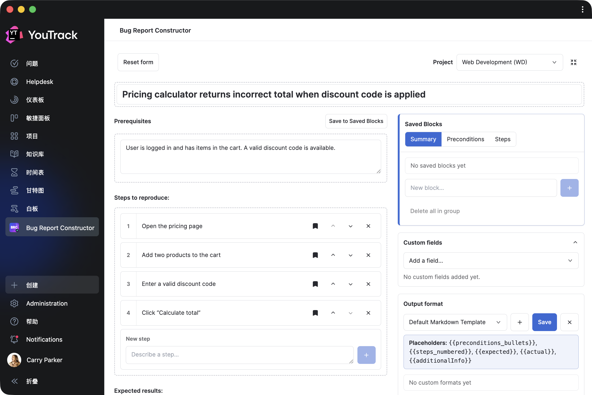 Evgenii Venediktov 提供的 Bug Report Constructor 允许 QA 团队使用单一模板收集 Bug 报告,并让用户能够通过预先保存的块快速创建任务草稿。