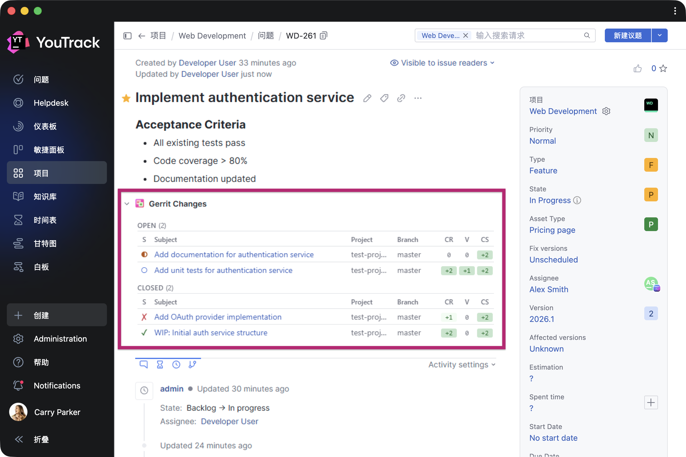 Phoenix Systems 提供的 Gerrit Integration 可以帮助开发者直接在任务中显示相关的 Gerrit 代码审查更改,包括状态、审批和链接。