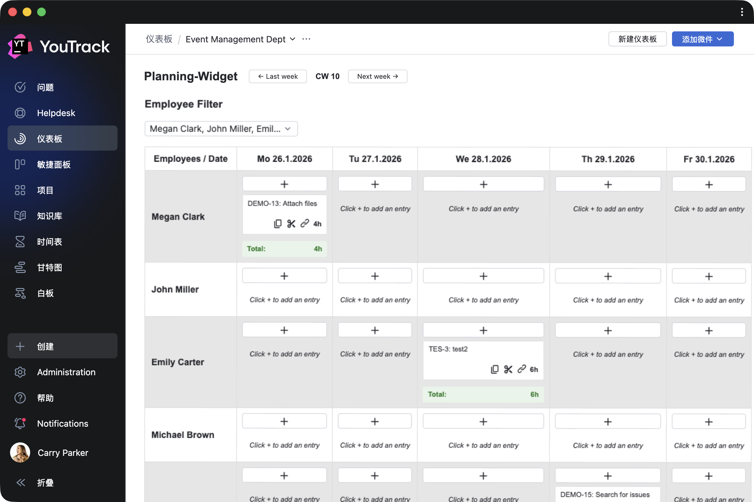 CARL von CHIARI 提供的 Planning Widget 可以帮助经理在日历视图中计划团队活动。审查团队成员每天处理的任务和工单、跟踪花费的时间,并按员工筛选视图。