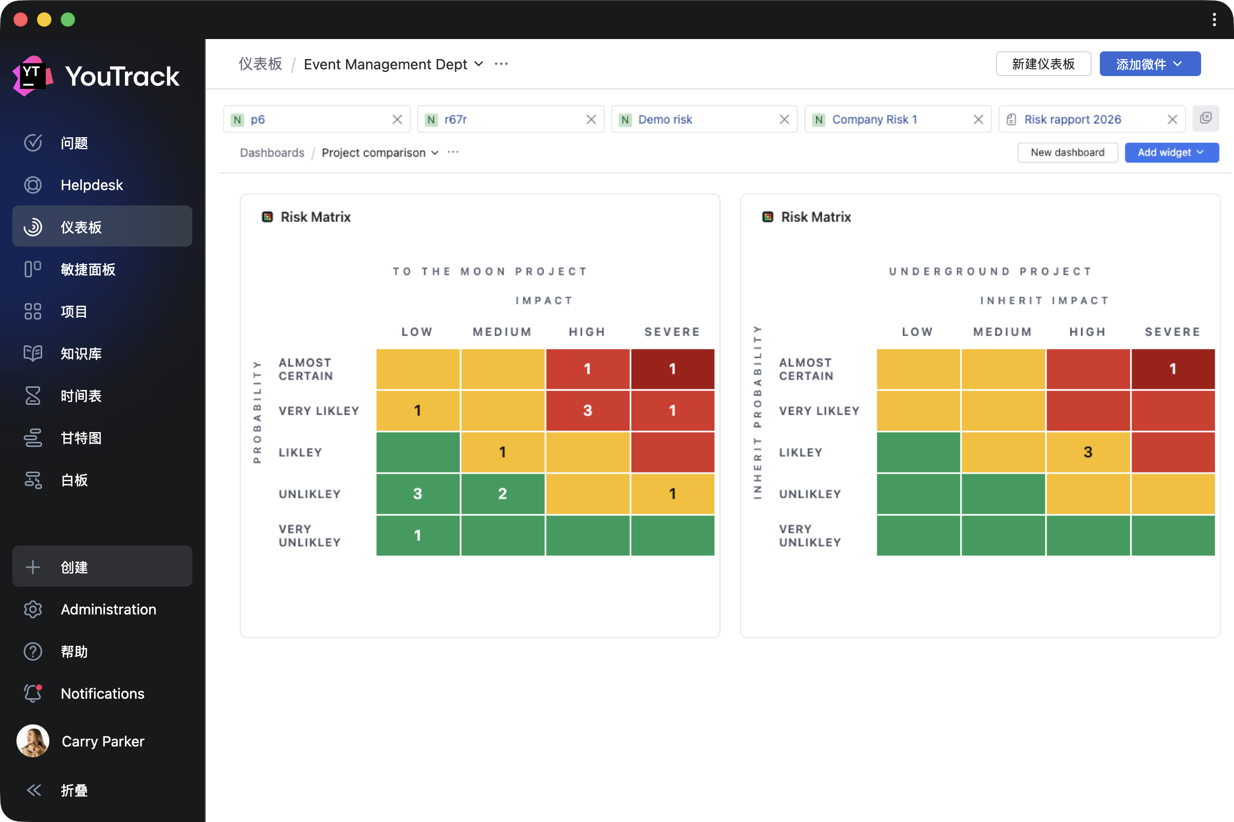 Rixter AB 提供的 Risk Manager 可以根据所选任务出现特定结果的概率及所产生的影响构建风险矩阵微件,从而帮助项目经理评估项目风险等级。